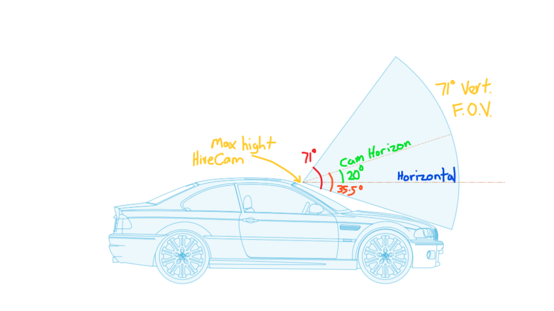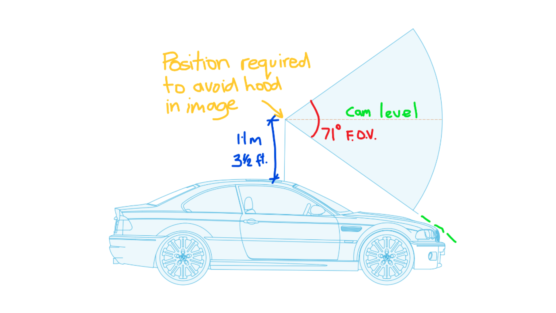 A community member explained that you need a vehicle with a near-vertical windshield and a short hood to get an average placement from inside the car and in perfect order. To mount the camera level and avoid tilting it up at the sky, you need to mount it 1.1m or just over 3 1/2 feet above the roof of the average car to get a high-quality image.
