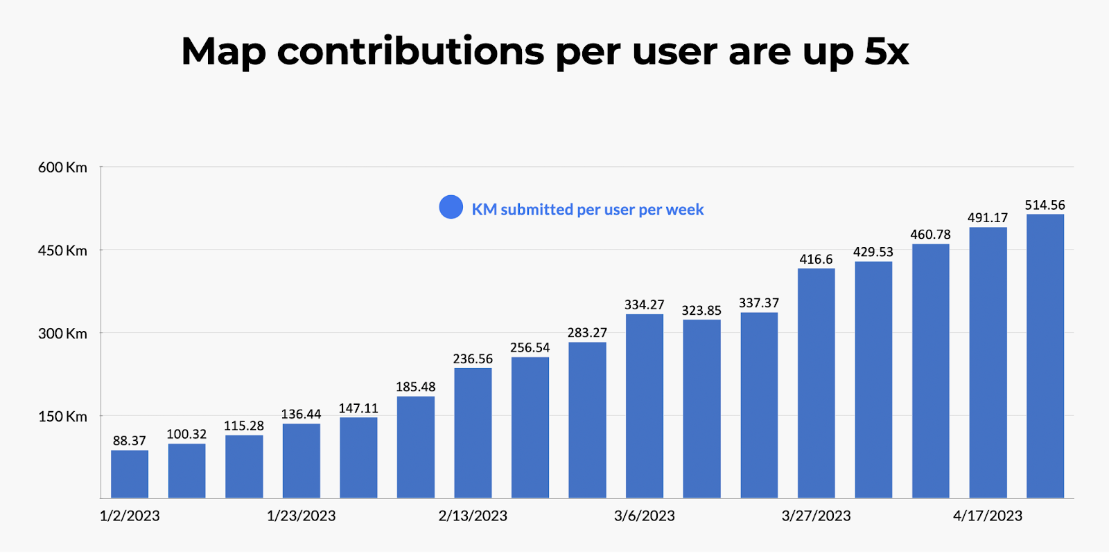 We reacted to this feedback with a steady series of firmware and app updates, and the impact is clear. At the beginning of the year, the average map contributor mapped the equivalent of 88.4 kilometers of roads per week. Today, this number is more than 5x higher at 514.6 km per week.
