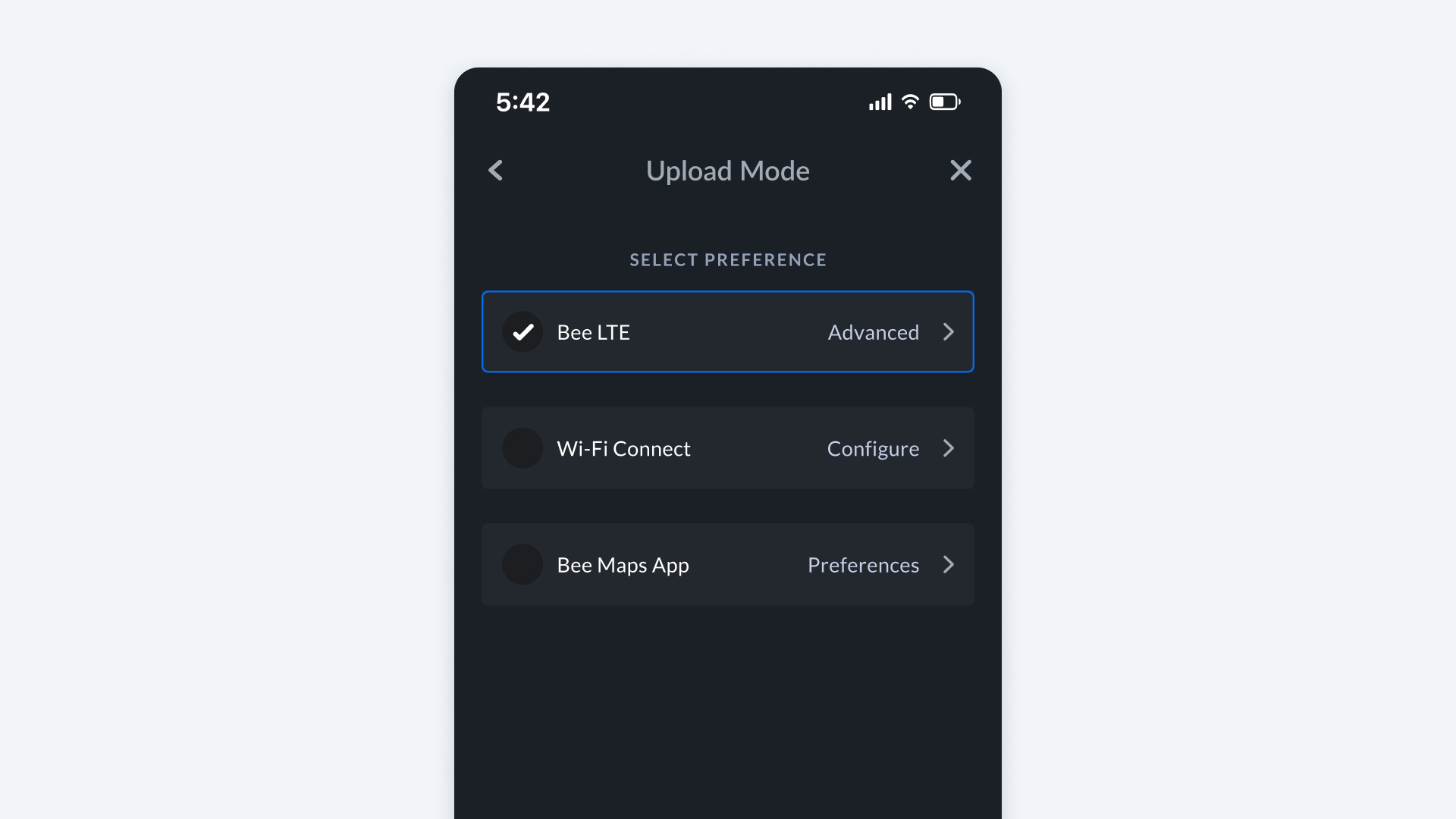 If you're not sure, start with WiFi Connect. It's free, it's passive, and you can switch to LTE anytime if you want real-time uploads. All three modes are configured in the Bee Maps App under Settings > Data > Upload Mode.
