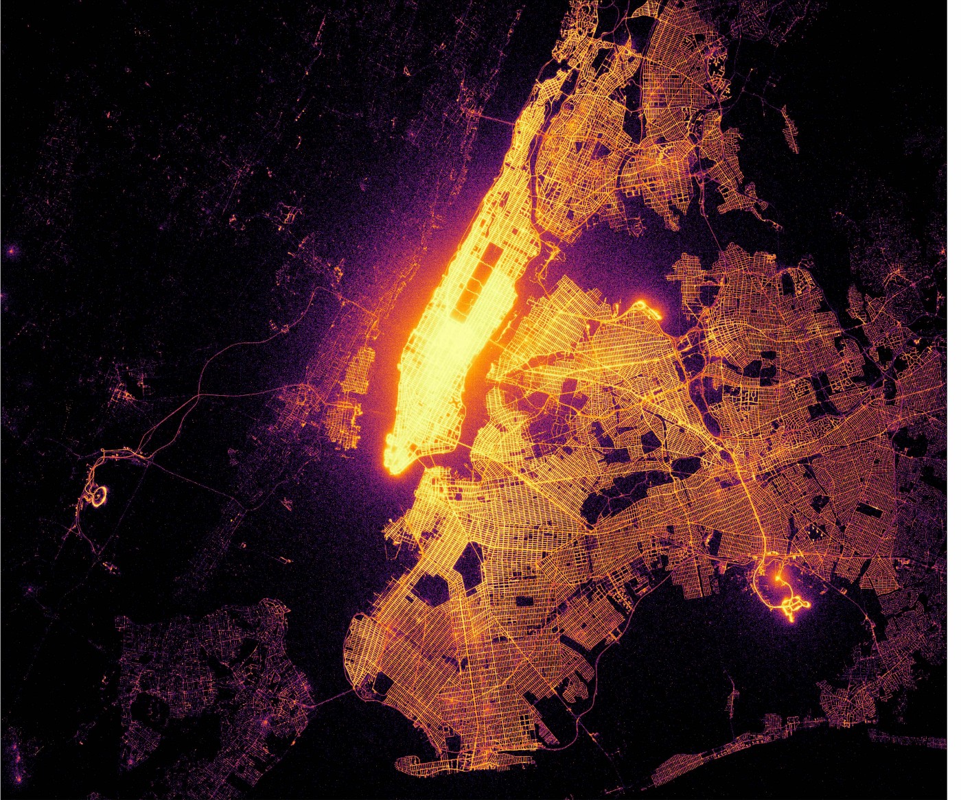 If taxi trips were fireflies. 1.3 billion NYC taxi trips were plotted to create this stunning map.
