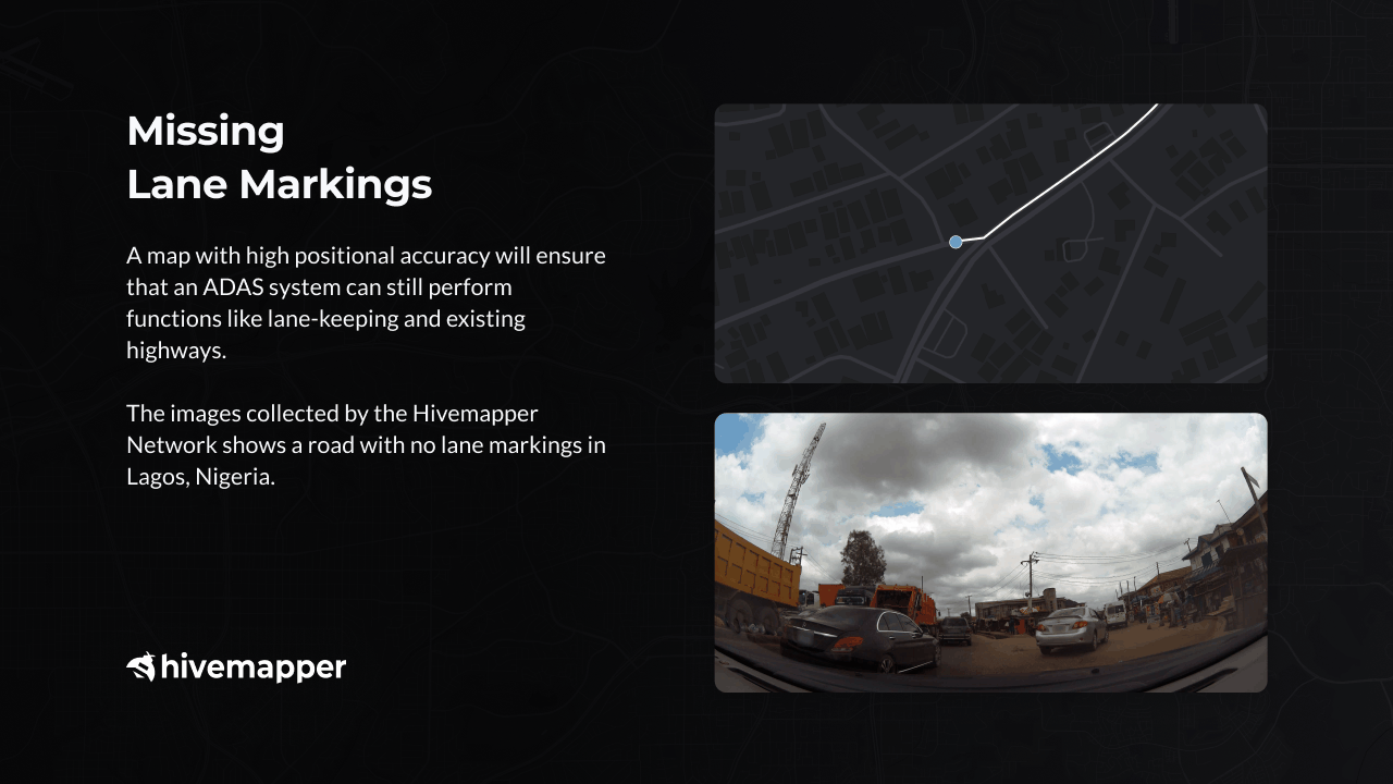 Missing Lane Markings. Visualize a bustling metropolis like Lagos, Nigeria. When lane markings are missing, a map with high positional accuracy becomes indispensable. Using a map, an ADAS system can still perform functions like lane-keeping and exiting highways.