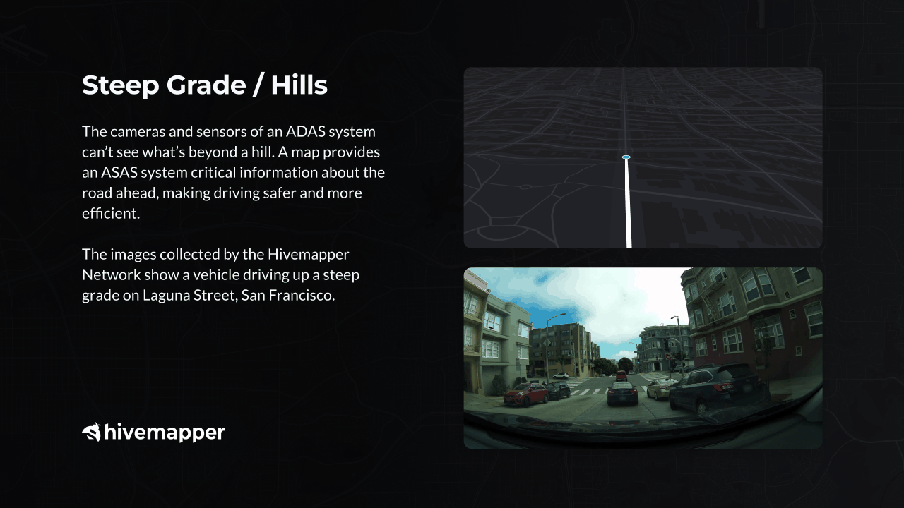 Poor Weather Conditions. Driving the hilly and winding roads of San Francisco when they’re shrouded in the city’s signature fog is difficult even for the most experienced driver. As the thick fog obscures the road ahead, a map provides an ADAS system critical data about the city’s streets, road signs, and landmarks to drive safely.