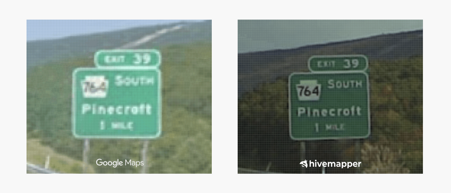 On the right you see a street-level image collected by the Hivemapper Dashcams outside of Pittsburgh, PA. On the left you see a Google Street View image. These two images were captured at the same location. If you zoom in, you see the higher resolution of the Hivemapper image. It’s important to see signs to map, so we prioritized the lens resolution when designing the Hivemapper Dashcam.