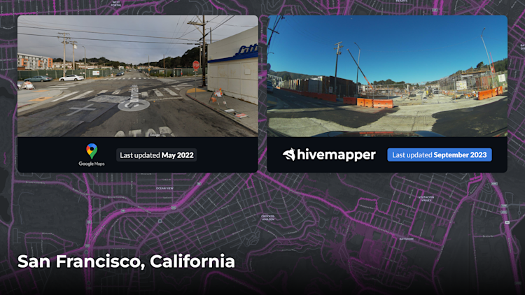 In some rapidly growing urban areas, new roads, intersections, and addresses are added faster than maps are updated. If you’re running a delivery fleet like FedEx or a rideshare service like Uber, the efficiency of your operations depends on an accurate representation of the world. Maps are stale and spotty because specialized mapping vehicles are expensive to own and operate. In the example below, the Google Street View image is from May 2022 and shows a road where Hivemapper captured a construction site recently.