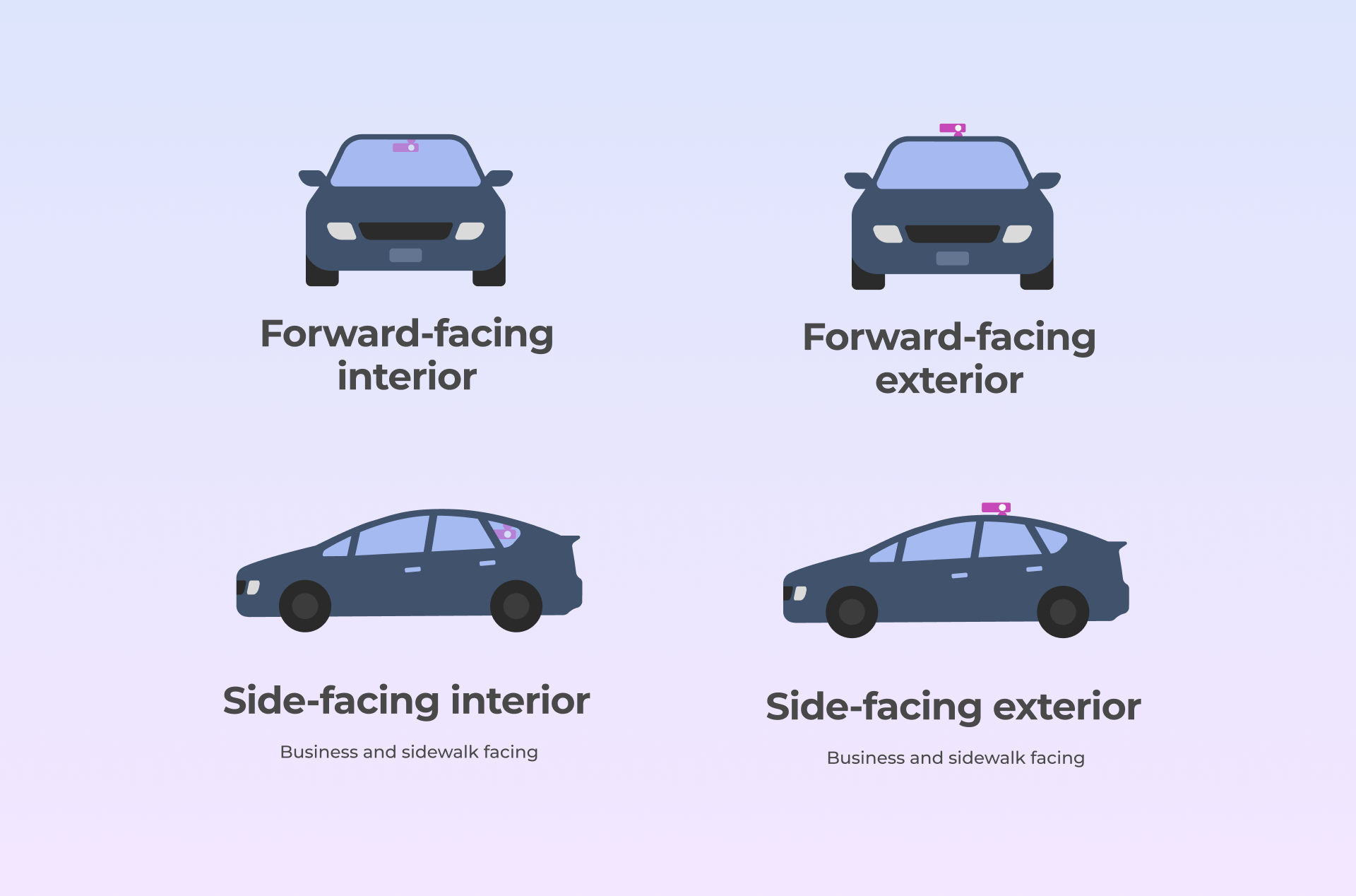 A maximum of two dashcams can be mounted per vehicle: one forward-facing and one side-facing. If you decide to mount the dashcam side-facing, it must face the sidewalk and buildings (i.e. mounted on the passenger side of the vehicle).