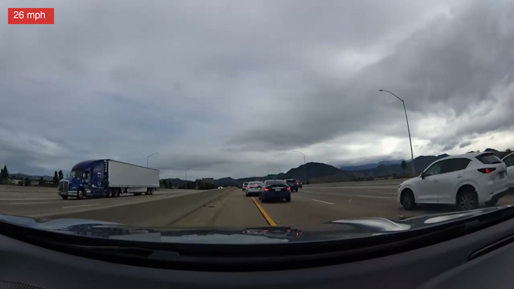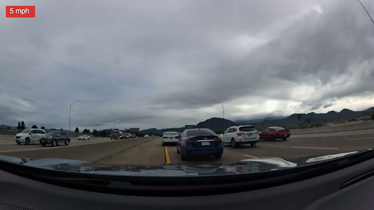 This is what highway engineers call a shockwave: a pulse of deceleration that propagates backward through traffic, often faster than the vehicles are moving forward. A driver a quarter mile ahead taps their brakes. The driver behind brakes slightly harder. The effect amplifies with each successive vehicle until, several cars back, someone is executing a full emergency stop from 70 mph. The camera vehicle was deep enough in the chain that the stop was violent. Closing on the bumper — the highway grinding toward a halt, retaining walls on both sides leaving no escape route.