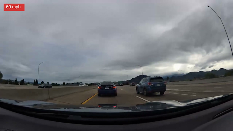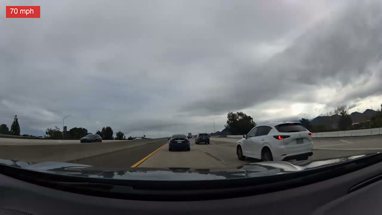 Ten seconds in — the white SUV is visible in the right lane, brake lights on. A dark sedan ahead. Nothing alarming yet.