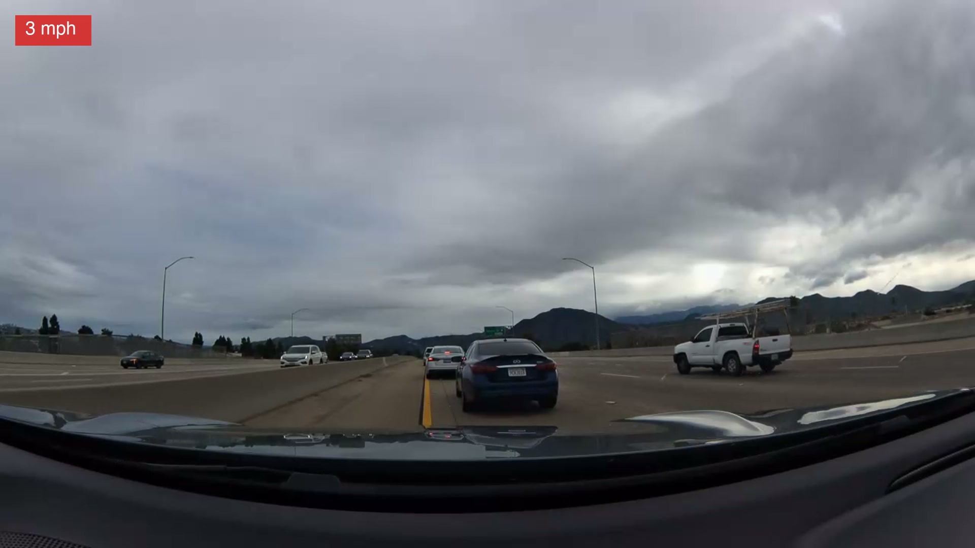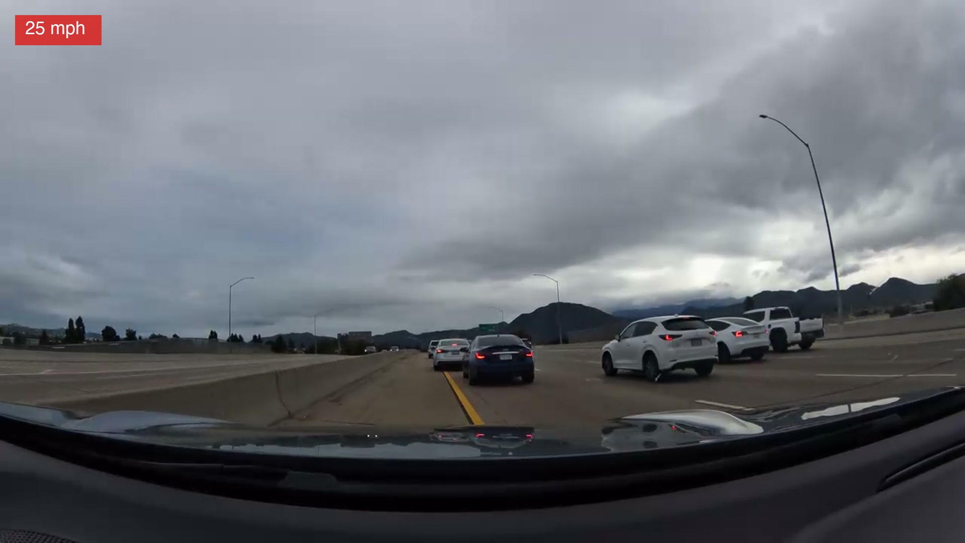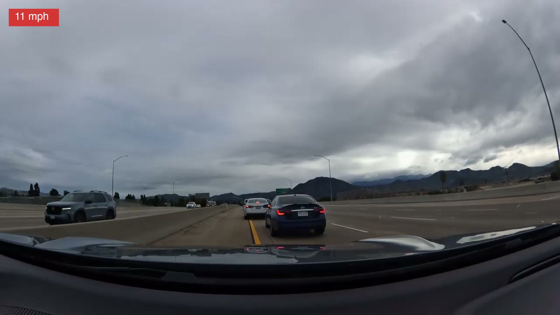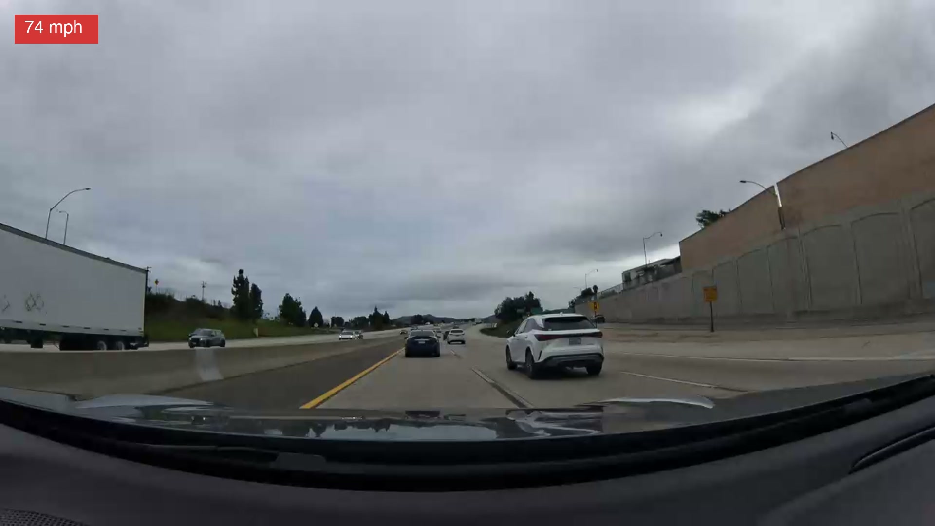 Ten seconds in — the white SUV is visible in the right lane, brake lights on. A dark sedan ahead. Nothing alarming yet.