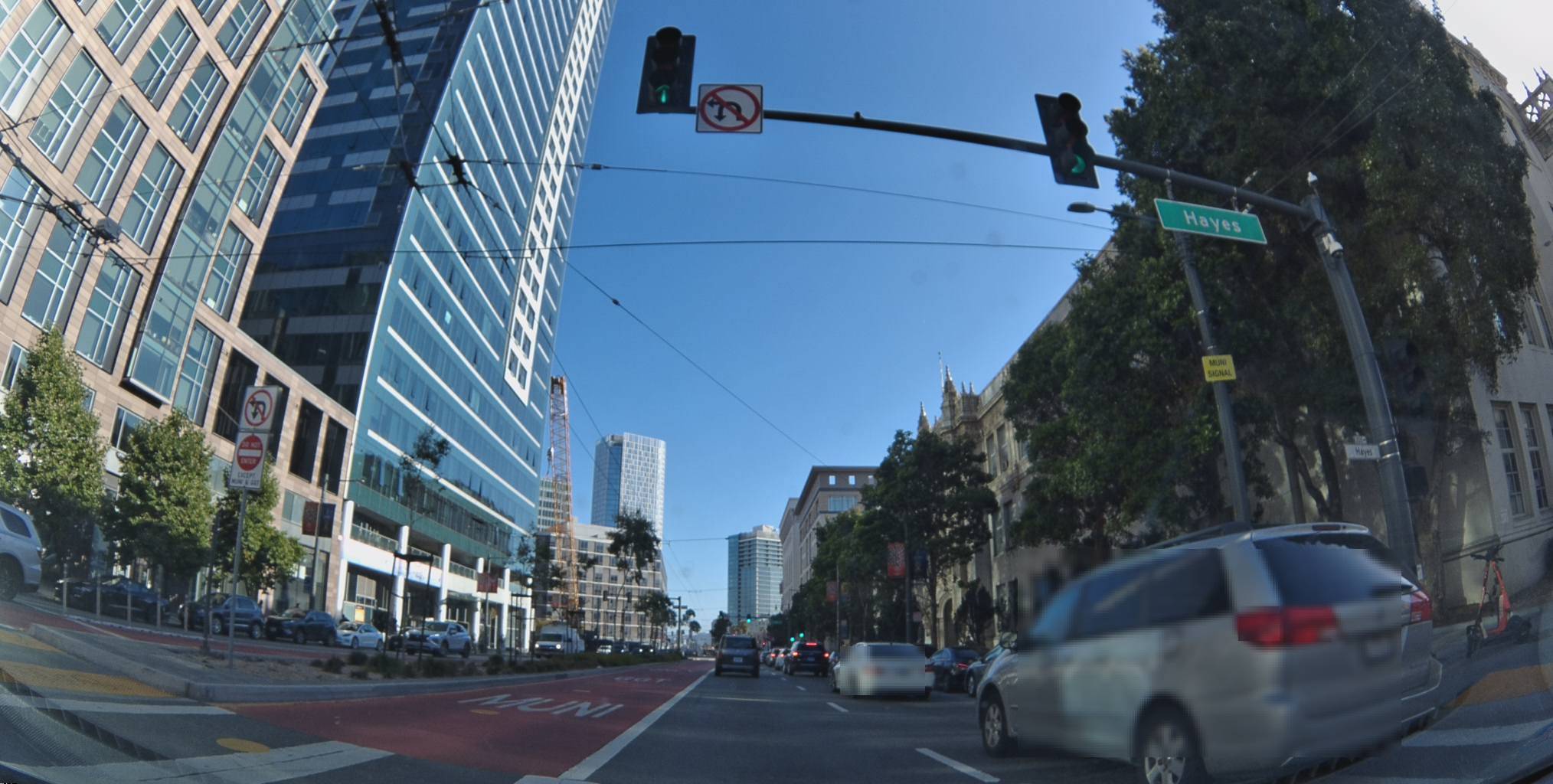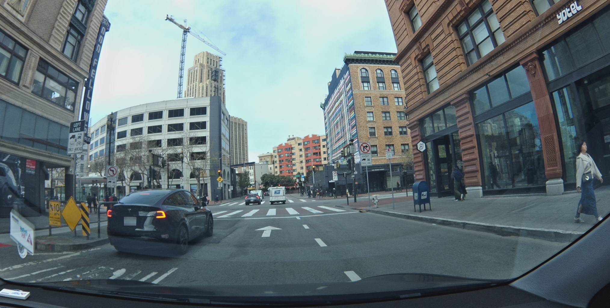 }'Look at this frame near Civic Center. A no-right-turn sign on the right. A "LEFT LANE ONLY AHEAD" sign on the left. Directional arrows painted on the road. A pedestrian mid-crosswalk. You're watching the Tesla's brake lights. The Bee is reading every sign in the frame.