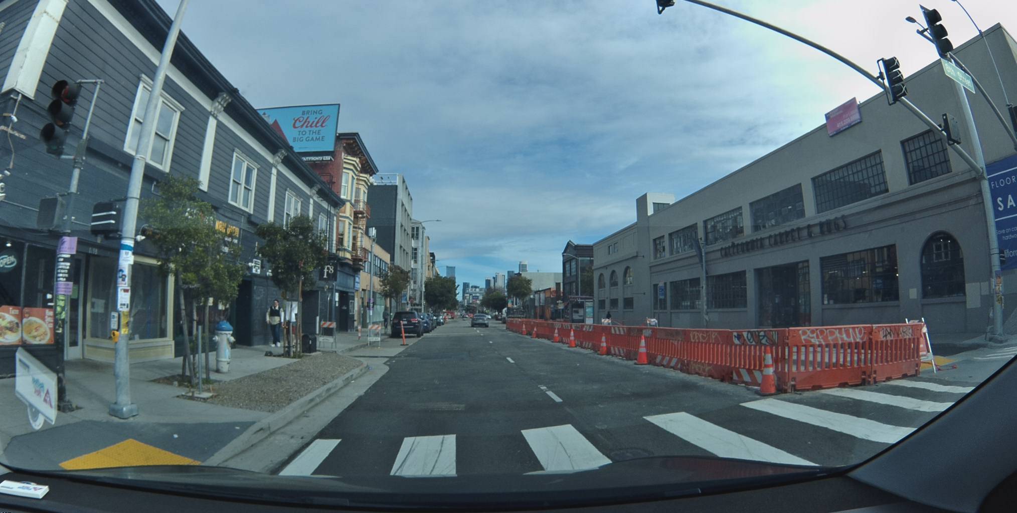 - Orange construction barriers lining the left side