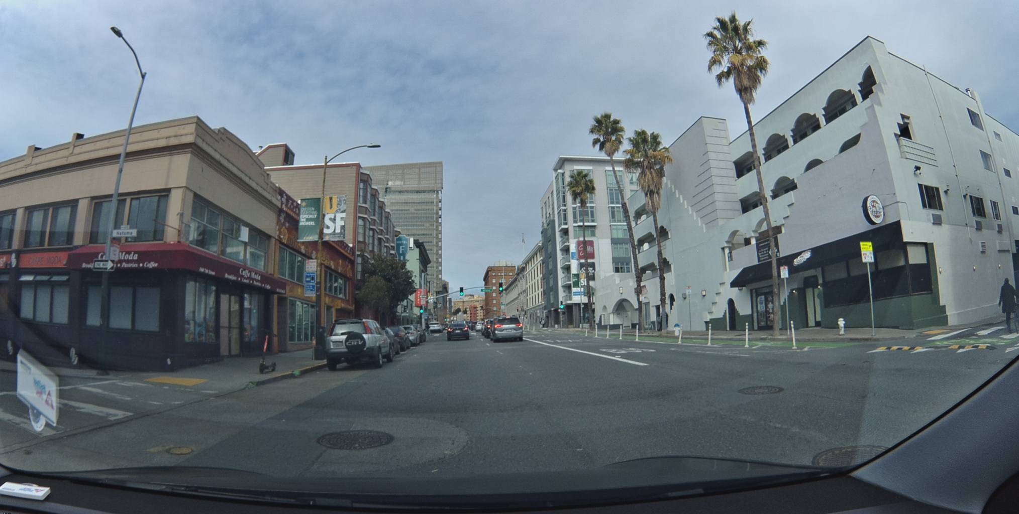 A quieter stretch. Palm trees. Storefronts. Parked cars.