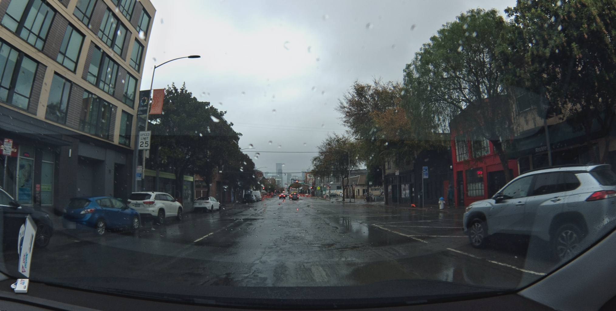 }'The kind of block you forget the moment you drive past it. But the Bee is still working. Reading the street name sign ahead. Noting the lane markings. Logging the traffic signal state. This frame — one of 247 — will be processed for every road feature visible in the field of view.