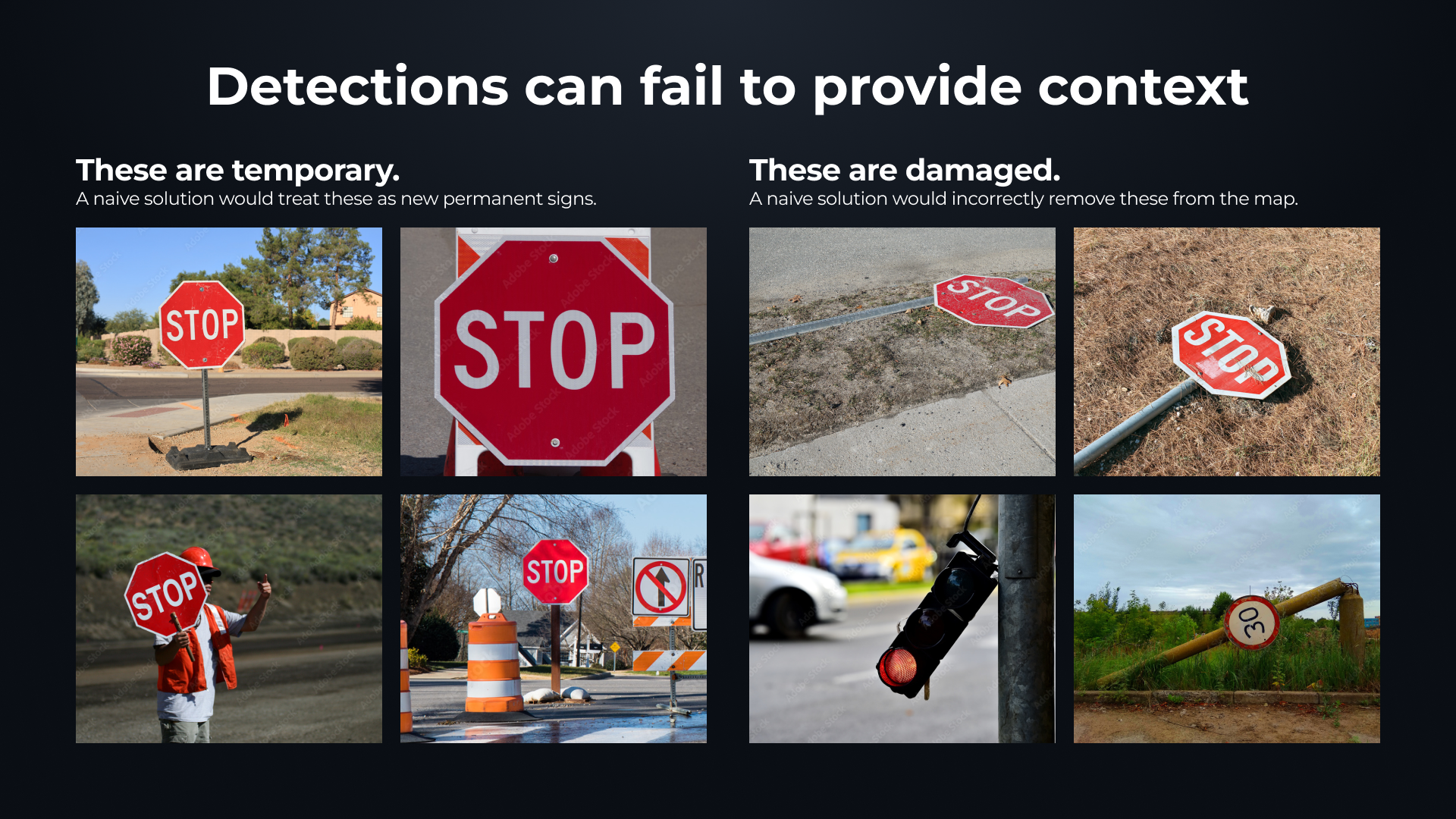 Detections can fail to provide context. For example, temporary signs often look the same as permanent ones. Detecting a sign isn’t that useful for mapmaking if the sign is only present for a limited time while a construction crew is working. This is obvious to a human eye, but difficult for AI.