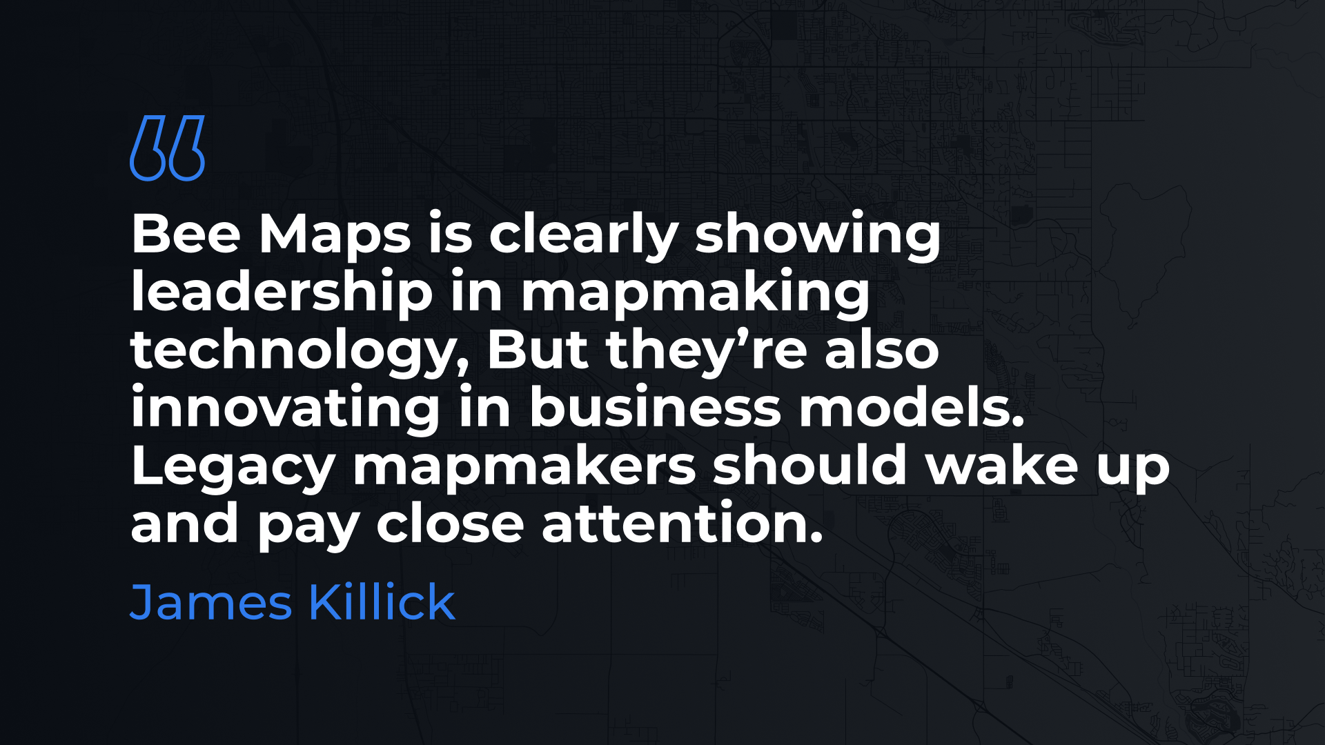 “Bee Maps is clearly showing leadership in mapmaking technology,” Killick says. “But they’re also innovating in business models. Legacy mapmakers should wake up and pay close attention.”