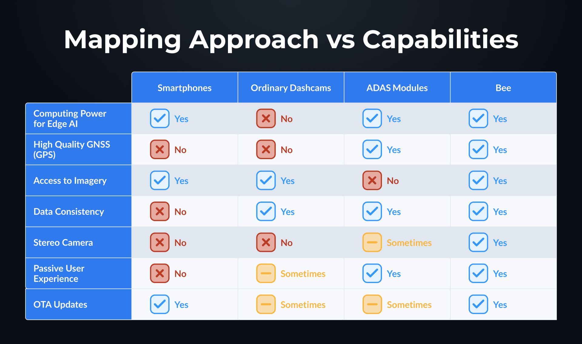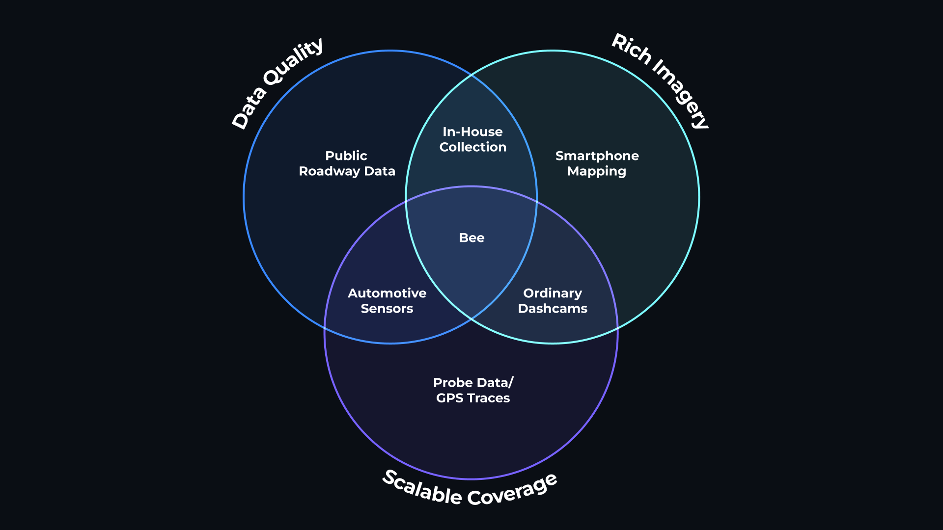 We designed the Bee to solve the trilemma. It has rich imagery. It has higher quality data than any smartphone or ordinary dashcam. And it offers a scalable model for achieving full global coverage.