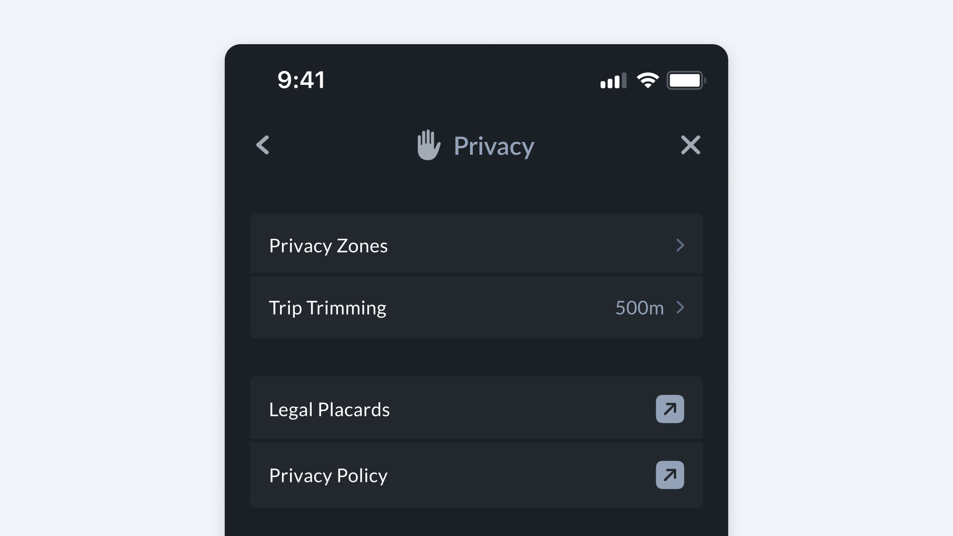 - Trip Trimming -- Automatically trim the start and end of trips (default: 500m) to avoid recording exact departure or arrival points.